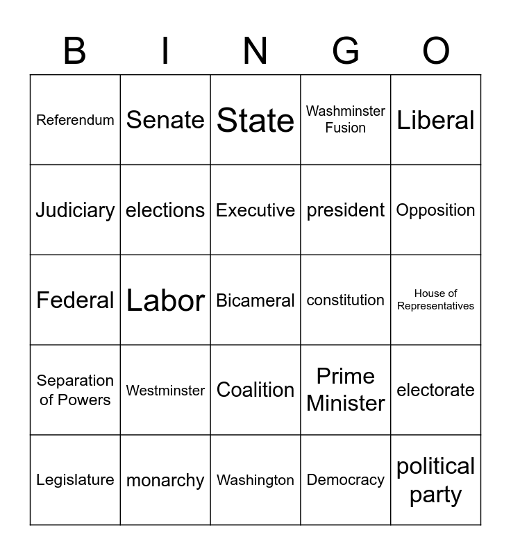This bingo card has a free space and 24 words: Westminster, monarchy, Executive, Legislature, Liberal, Referendum, Judiciary, Senate, constitution, Coalition, president, Federal, Prime Minister, electorate, elections, Democracy, House of Representatives, State, Opposition, Labor, political party, Separation of Powers, Washminster Fusion and Washington.