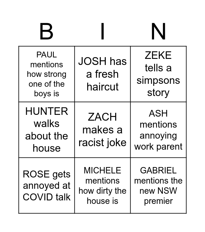 This bingo card has a free space and 8 words: ASH mentions annoying work parent, ZEKE tells a simpsons story, JOSH has a fresh haircut, ROSE gets annoyed at COVID talk, PAUL mentions how strong one of the boys is, GABRIEL mentions the new NSW premier, HUNTER walks about the house and MICHELE mentions how dirty the house is.