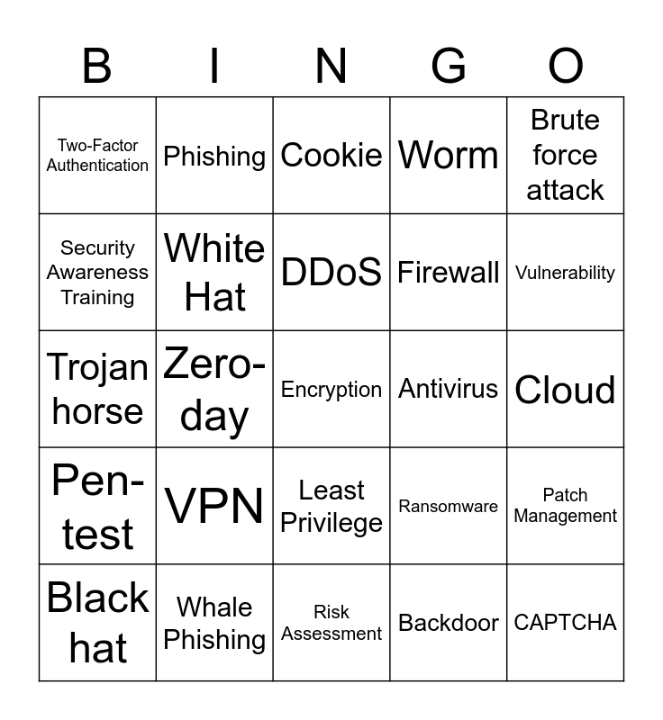 This bingo card has 25 words: VPN, Risk Assessment, DDoS, Black hat, Brute force attack, Two-Factor Authentication, Security Awareness Training, Phishing, Antivirus, Least Privilege, Firewall, Trojan horse, Ransomware, Patch Management, White Hat, CAPTCHA, Cloud, Cookie, Vulnerability, Zero-day, Encryption, Whale Phishing, Pen-test, Worm and Backdoor.
