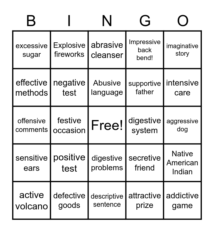 This bingo card has a free space and 29 words: active volcano, cursive handwriting, festive occasion, massive rock, excessive sugar, abrasive cleanser, negative test, positive test, digestive system, defective goods, aggressive dog, addictive game, descriptive sentence, attractive prize, intensive care, exclusive deals, digestive problems, sensitive ears, imaginative story, offensive comments, secretive friend, attentive students, supportive father, effective methods, Impressive back bend!, Explosive fireworks, Native American Indian, Abusive language and Defective toy.