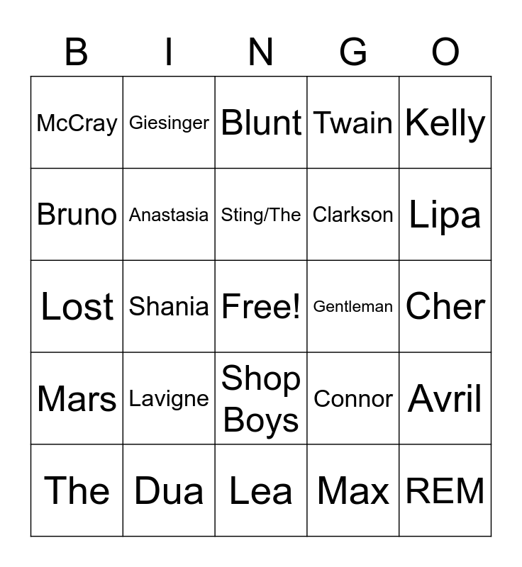 This bingo card has a free space and 38 words: Roxette, Maffay, Lindenberg, Anastasia, Avril, Lavigne, Sting/The, Police, Kelly, Clarkson, Shania, Twain, REM, Cher, Bruno, Mars, James, Blunt, Coldplay, Gentleman, McCray, Dua, Lipa, The, Wknd, Lea, Greenday, Britney, Spears (20), Revolverheld, Pet, Shop Boys, Max, Giesinger, Sarah, Connor, Lost and Frequency.