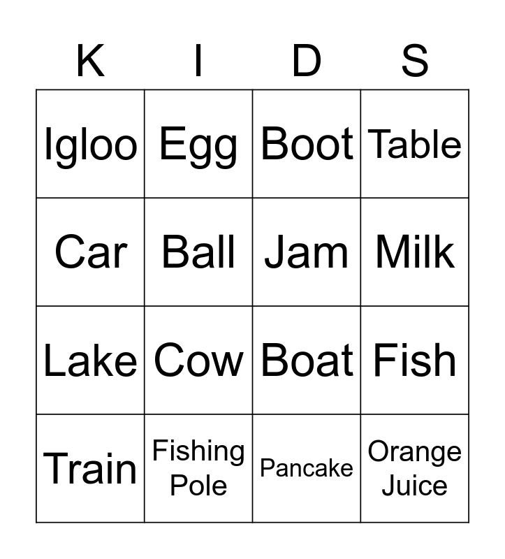 This bingo card has 16 words: Train, Fishing Pole, Boot, Table, Car, Egg, Boat, Fish, Igloo, Ball, Pancake, Milk, Lake, Cow, Jam and Orange Juice.