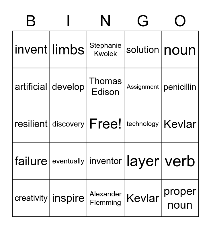 This bingo card has a free space and 29 words: Design, inspire, Stephanie Kwolek, product, noun, invent, develop, Thomas Edison, technology, verb, creativity, discovery, Kevlar, proper noun, resilient, produce, Alexander Flemming, layer, penicillin, failure, eventually, Lewis Latimer, Assignment, Kevlar, artificial, limbs, inventor, solution and light bulb.