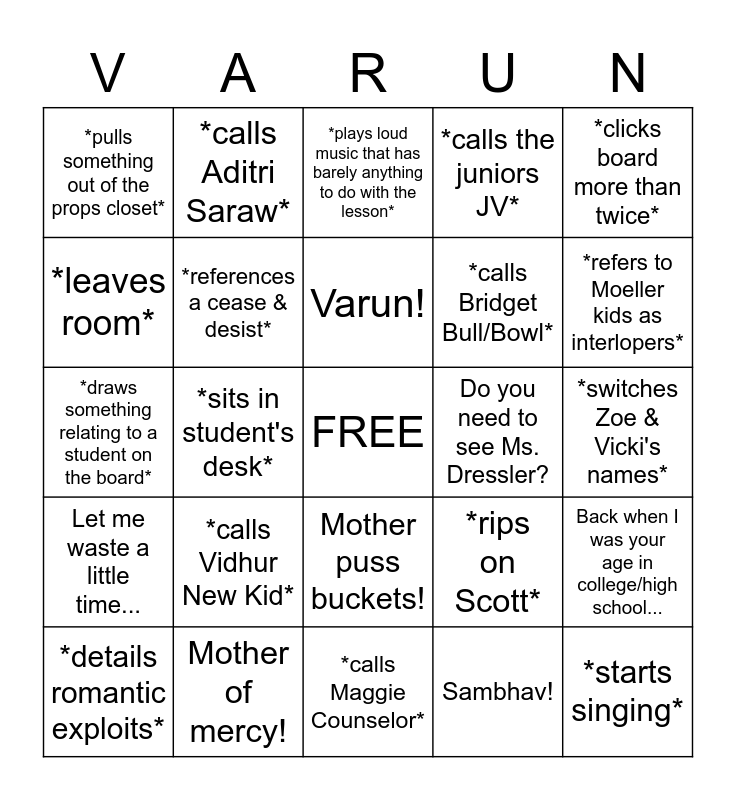 This bingo card has a free space and 26 words: Mother puss buckets!, Sambhav!, Varun!, Mother of mercy!, *clicks board more than twice*, *pulls something out of the props closet*, *leaves room*, *calls Aditri Saraw*, *switches Zoe & Vicki's names*, *rips on Scott*, *calls Bridget Bull/Bowl*, *draws something relating to a student on the board*, Back when I was your age in college/high school..., *details romantic exploits*, *sits in student's desk*, *passes out food/drink*, *calls the juniors JV*, Let me waste a little time..., *plays loud music that has barely anything to do with the lesson*, *starts singing*, *refers to Moeller kids as interlopers*, *calls Maggie Counselor*, Do you need to see Ms. Dressler?, *calls Vidhur New Kid*, *references a cease & desist* and *dead silence*.