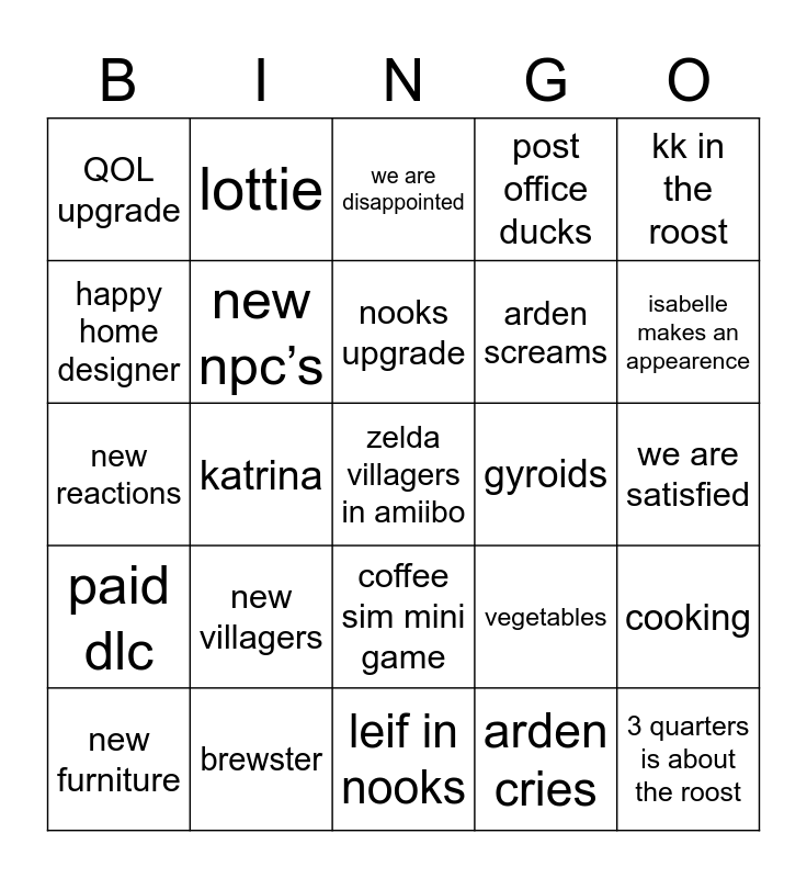This bingo card has a free space and 24 words: new villagers, brewster, nooks upgrade, new furniture, kk in the roost, QOL upgrade, happy home designer, lottie, gyroids, coffee sim mini game, arden screams, new reactions, vegetables, cooking, new npc’s, arden cries, we are satisfied, we are disappointed, isabelle makes an appearence, katrina, 3 quarters is about the roost, paid dlc, post office ducks and leif in nooks.