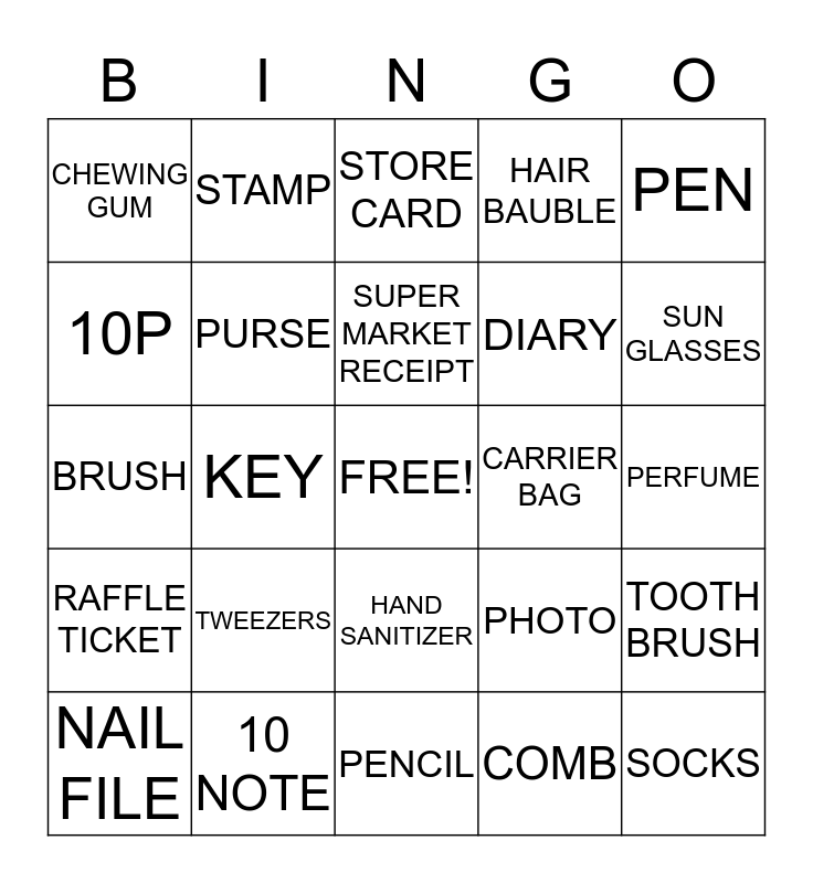 This bingo card has a free space and 24 words: TWEEZERS, 10 NOTE, SUPER MARKET RECEIPT, NAIL FILE, PEN, CHEWING GUM, 10P, STAMP, CARRIER BAG, HAND SANITIZER, DIARY, BRUSH, PHOTO, TOOTH BRUSH, PURSE, COMB, PERFUME, STORE CARD, SUN GLASSES, KEY, SOCKS, RAFFLE TICKET, HAIR BAUBLE and PENCIL.