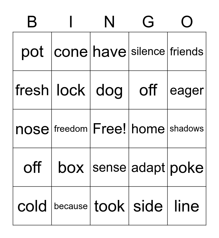 This bingo card has a free space and 24 words: box, because, dog, cold, friends, pot, fresh, cone, home, sense, off, nose, adapt, poke, lock, side, shadows, have, eager, freedom, line, off, silence and took.