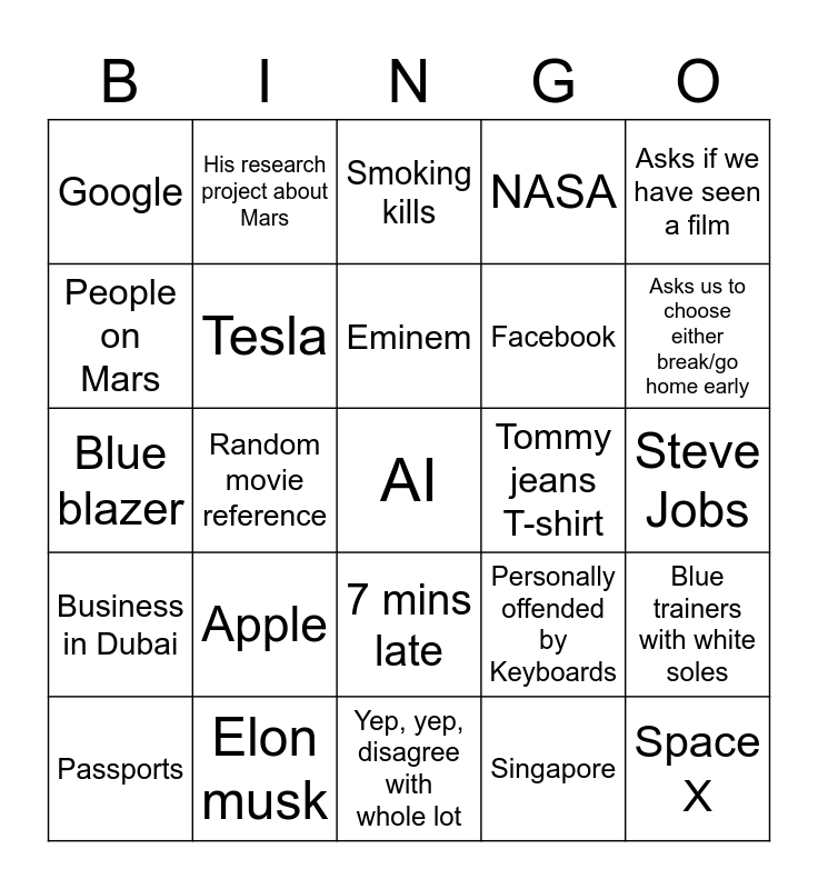 This bingo card has a free space and 24 words: Apple, Elon musk, Eminem, Passports, Asks if we have seen a film, Google, People on Mars, His research project about Mars, Tommy jeans T-shirt, 7 mins late, Facebook, Blue blazer, Personally offended by Keyboards, Blue trainers with white soles, Tesla, Singapore, Steve Jobs, Smoking kills, Asks us to choose either break/go home early, Random movie reference, Space X, Business in Dubai, NASA and Yep, yep, disagree with whole lot.