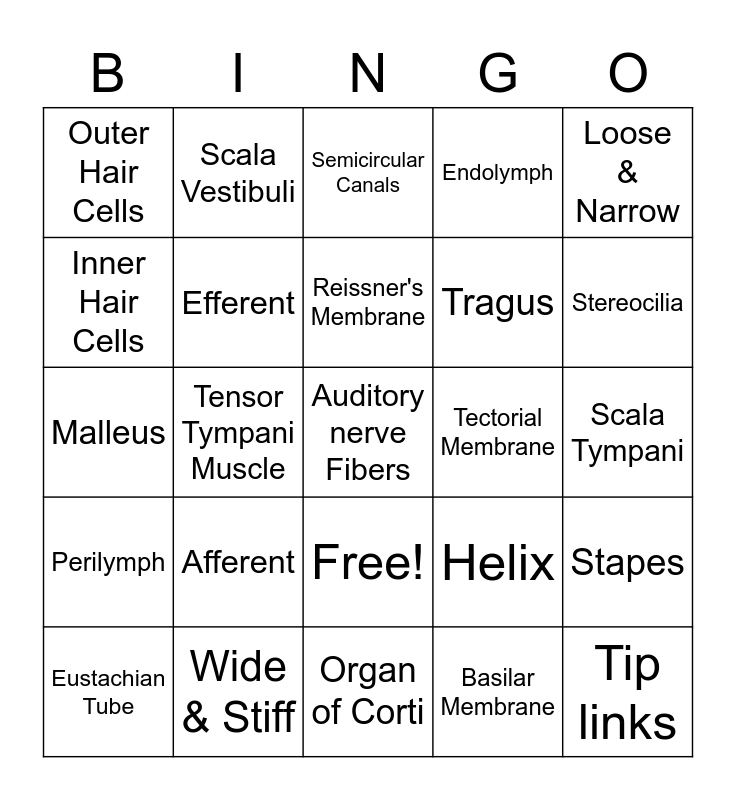 This bingo card has 26 words: Free!, Basilar Membrane, Reissner's Membrane, Wide & Stiff, Loose & Narrow, Outer Hair Cells, Inner Hair Cells, Scala Vestibuli, Scala Tympani, Helix, Tragus, Malleus, Stapes, Eustachian Tube, Tensor Tympani Muscle, Stapedial Muscle, Endolymph, Perilymph, Semicircular Canals, Auditory nerve Fibers, Stereocilia, Organ of Corti, Tectorial Membrane, Afferent, Efferent and Tip links.