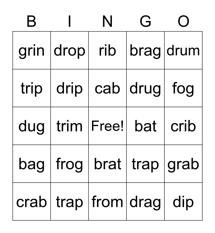 This bingo card has a free space and 24 words: frog, trap, cab, crab, drum, grin, trip, drop, bat, brat, drug, dug, trap, grab, drip, drag, crib, rib, fog, trim, dip, bag, brag and from.