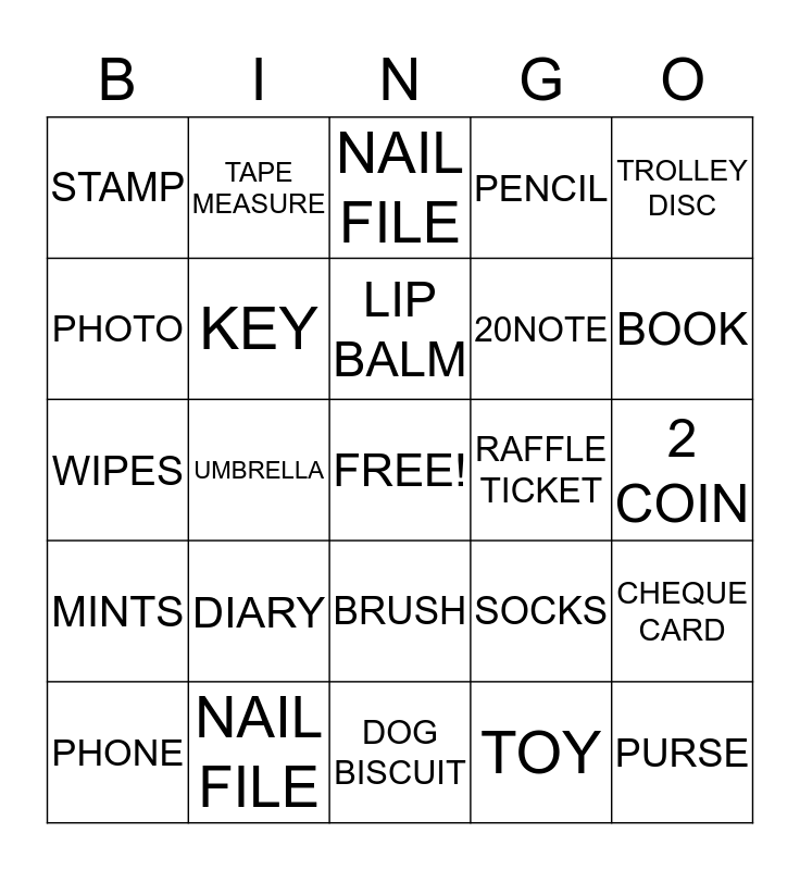 This bingo card has a free space and 24 words: DIARY, NAIL FILE, LIP BALM, PHONE, TROLLEY DISC, STAMP, PHOTO, TAPE MEASURE, RAFFLE TICKET, BRUSH, 20NOTE, WIPES, SOCKS, CHEQUE CARD, KEY, TOY, 2 COIN, NAIL FILE, BOOK, UMBRELLA, PURSE, MINTS, PENCIL and DOG BISCUIT.