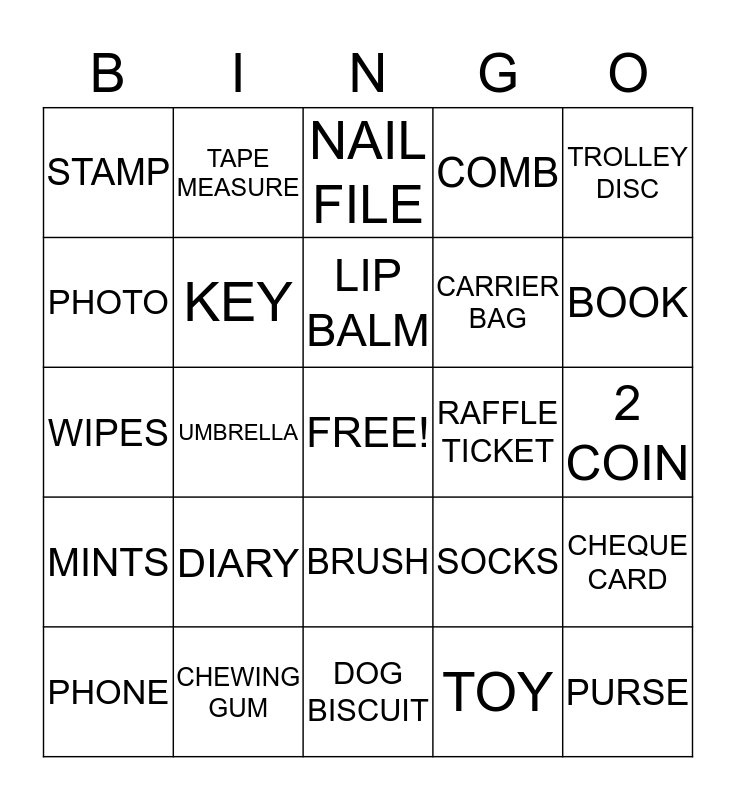 This bingo card has a free space and 24 words: DIARY, CHEWING GUM, LIP BALM, PHONE, TROLLEY DISC, STAMP, PHOTO, TAPE MEASURE, RAFFLE TICKET, BRUSH, CARRIER BAG, WIPES, SOCKS, CHEQUE CARD, KEY, TOY, 2 COIN, NAIL FILE, BOOK, UMBRELLA, PURSE, MINTS, COMB and DOG BISCUIT.