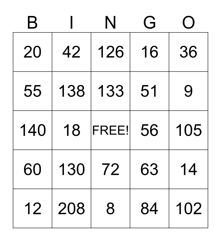 This bingo card has a free space and 24 words: 130, 208, 133, 12, 36, 20, 55, 42, 56, 72, 51, 140, 63, 14, 138, 84, 105, 126, 9, 18, 102, 60, 16 and 8.