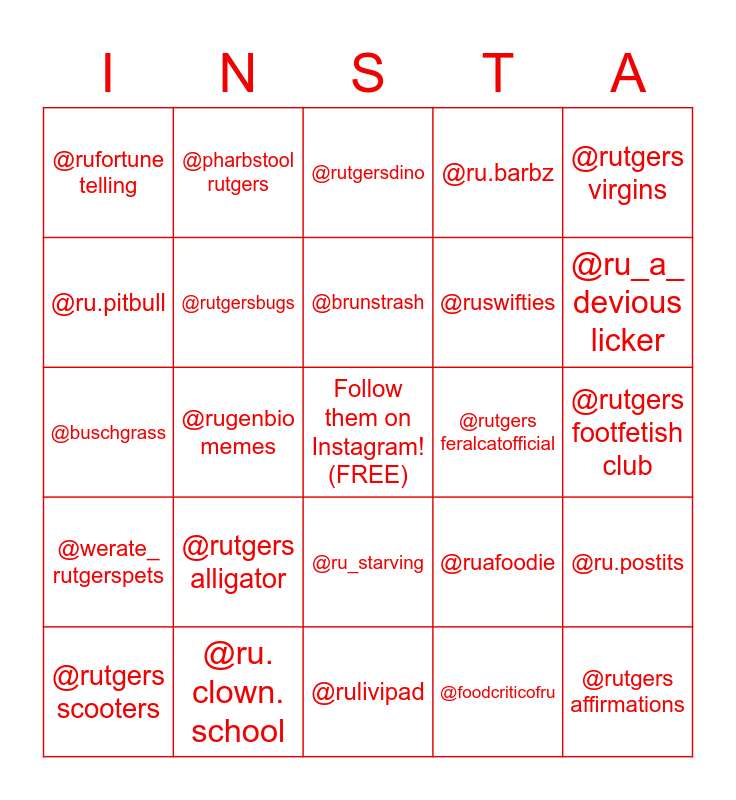 This bingo card has a free space and 51 words: @rutgers. bingo. goose, @rutgers affirmations, @rutgers confessions, @rulivipad, @rutgers alligator, @bathrooms of ru, @pharbstool rutgers, @rutgers. buses, @ru.pitbull, @ru_spoons, @rutgersbugs, @ru.barbz, @ru.postits, @ruafoodie, @rutgers coyote, @rugirlboss, @brunstrash, @rutgers feralcatofficial, @browerfoodies, @rutgers virgins, @rugenbio memes, @foodcriticofru, @rufortune telling, @ruswifties, @rutgers. missed connections, @rutgers buscult, @ru_a_ devious licker, @rutgersbarbz, @rutgers scooters, @rutgersdino, @ru.studyspots, @ruzodiac, @ruthe trashman, @rudawgs, @ru_ sebastian stan, @ru. clown. school, @ru_ a_spaceman, @ru_ greencum bandit, @ru_ opinionated, @ru_a_ rutgers_ meme_ account, @rutgers footfetish club, @werate_ rutgerspets, @ru.dating, @rutgers twihards, @rurancid, @rutgers conspiracies, @buschgrass, @rutgers_water, @ru_breathing, @ru_starving and @rutgers chicks.