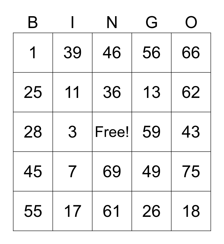 This bingo card has a free space and 24 words: 7, 17, 36, 55, 66, 1, 25, 39, 59, 69, 13, 28, 49, 75, 11, 26, 43, 46, 62, 3, 18, 45, 56 and 61.