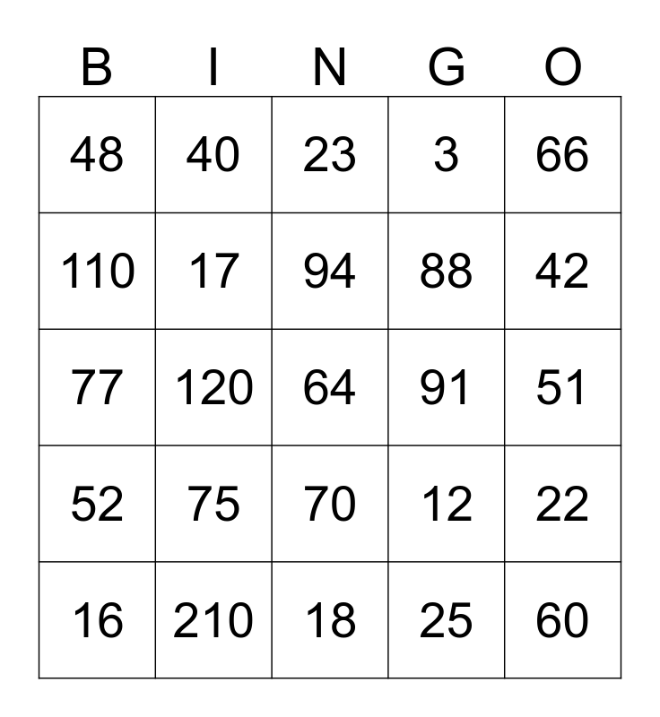 This bingo card has a free space and 24 words: 75, 210, 94, 16, 66, 48, 110, 40, 91, 70, 88, 77, 12, 22, 17, 25, 51, 23, 42, 120, 60, 52, 3 and 18.