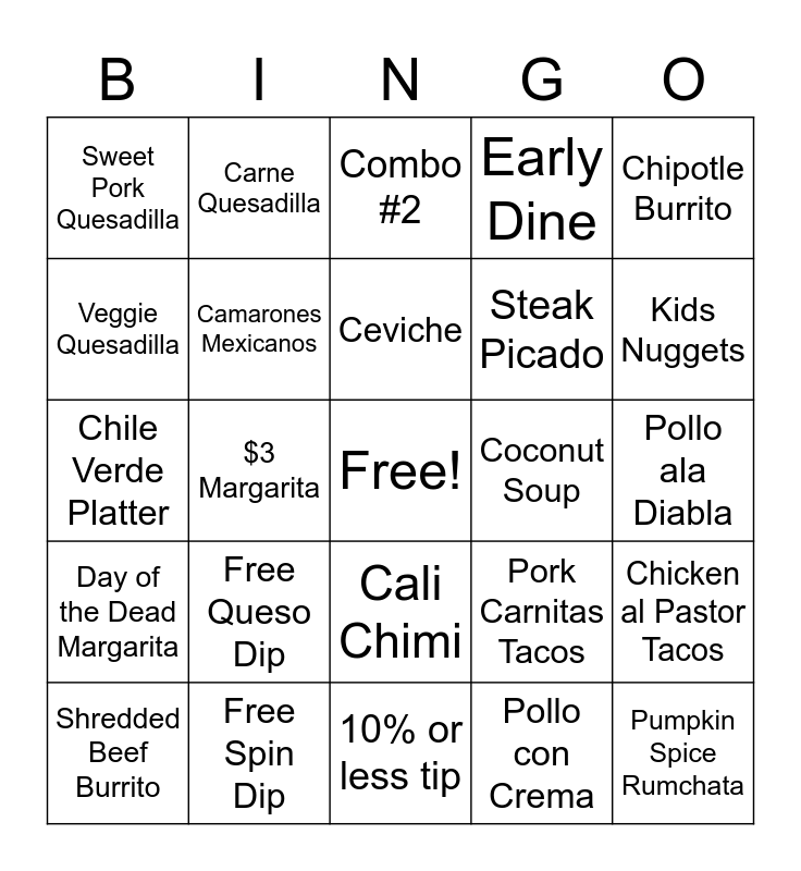 This bingo card has a free space and 24 words: Free Queso Dip, Free Spin Dip, Ceviche, Shredded Beef Burrito, Chipotle Burrito, Sweet Pork Quesadilla, Veggie Quesadilla, Carne Quesadilla, Coconut Soup, Cali Chimi, Steak Picado, Chile Verde Platter, Pork Carnitas Tacos, Chicken al Pastor Tacos, Camarones Mexicanos, Pollo con Crema, Pollo ala Diabla, Combo #2, Kids Nuggets, $3 Margarita, Pumpkin Spice Rumchata, Day of the Dead Margarita, Early Dine and 10% or less tip.