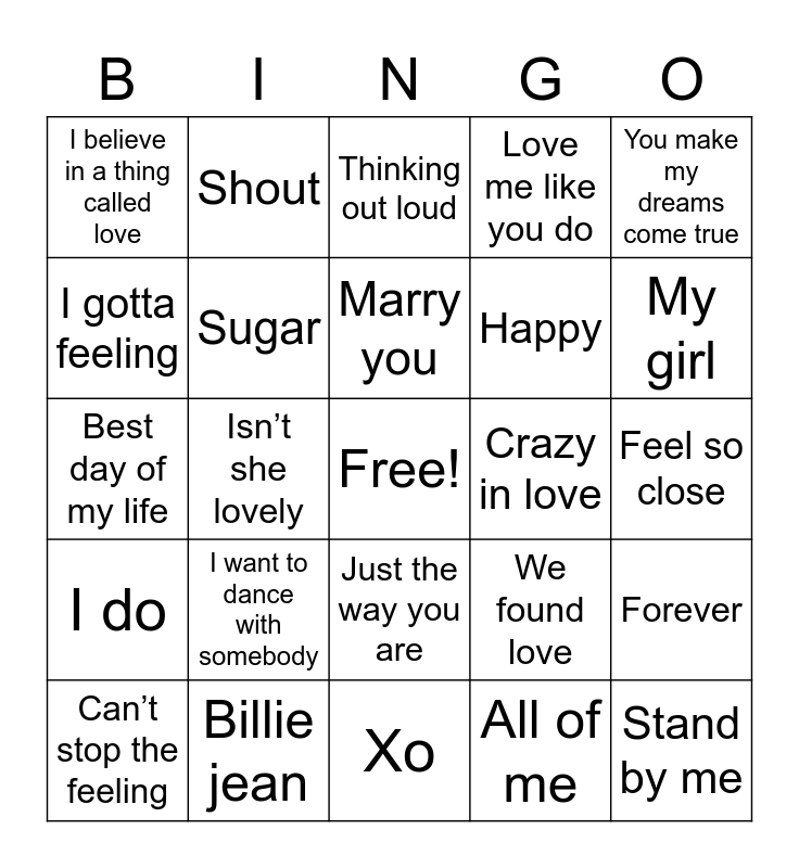 This bingo card has a free space and 24 words: I want to dance with somebody, Billie jean, Marry you, Can’t stop the feeling, You make my dreams come true, I believe in a thing called love, I gotta feeling, Shout, Crazy in love, Just the way you are, Happy, Best day of my life, We found love, Forever, Sugar, All of me, Feel so close, Thinking out loud, My girl, Isn’t she lovely, Stand by me, I do, Love me like you do and Xo.