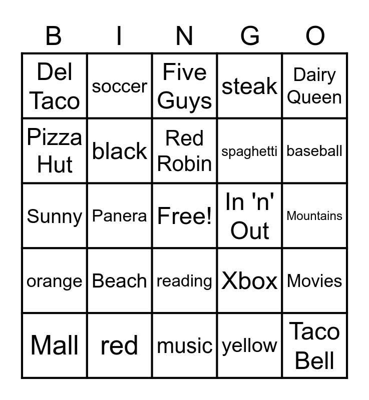 This bingo card has a free space and 60 words: blue, red, green, orange, yellow, brown, black, pizza, spaghetti, meatloaf, steak, McDonald's, Pizza Hut, Round Table Pizza, Carl's Jr., Del Taco, Taco Bell, Dairy Queen, Jack in the Box, Red Robin, In 'n' Out, Five Guys, Mall, Movies, Disneyland, Knotts Berry Farm, Soak City, Raging Waters, baseball, football, hockey, tennis, golf, swimming, soccer, horseback riding, gymnastics, Panera, The Habit, Sunny, Rainy, Beach, Mountains, Skating, Xbox, Playstation, Nintendo, Manga, Anime, reading, music, nap, cooking, eating out, ride a bike, take a walk, early riser, late riser, live action and animation.