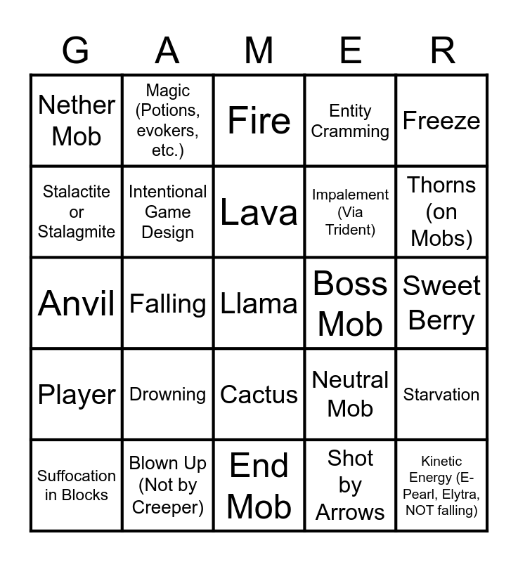 This bingo card has a free space and 26 words: Cactus, Shot by Arrows, Lava, Blown Up (Not by Creeper), Freeze, Nether Mob, Stalactite or Stalagmite, Magic (Potions, evokers, etc.), Sweet Berry, Neutral Mob, Impalement (Via Trident), Anvil, Starvation, Suffocation in Blocks, Falling, Hostile Overworld Mob, Entity Cramming, Player, Fire, Kinetic Energy (E-Pearl, Elytra, NOT falling), Thorns (on Mobs), End Mob, Boss Mob, Drowning, Intentional Game Design and Lightning.