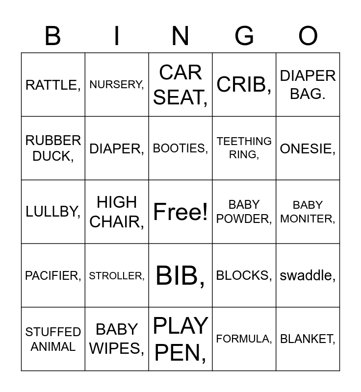 This bingo card has a free space and 24 words: STROLLER,, BABY WIPES,, BOOTIES,, STUFFED ANIMAL, DIAPER BAG., RATTLE,, RUBBER DUCK,, NURSERY,, BABY POWDER,, BIB,, TEETHING RING,, LULLBY,, BLOCKS,, swaddle,, DIAPER,, FORMULA,, BABY MONITER,, CAR SEAT,, ONESIE,, HIGH CHAIR,, BLANKET,, PACIFIER,, CRIB, and PLAY PEN,.