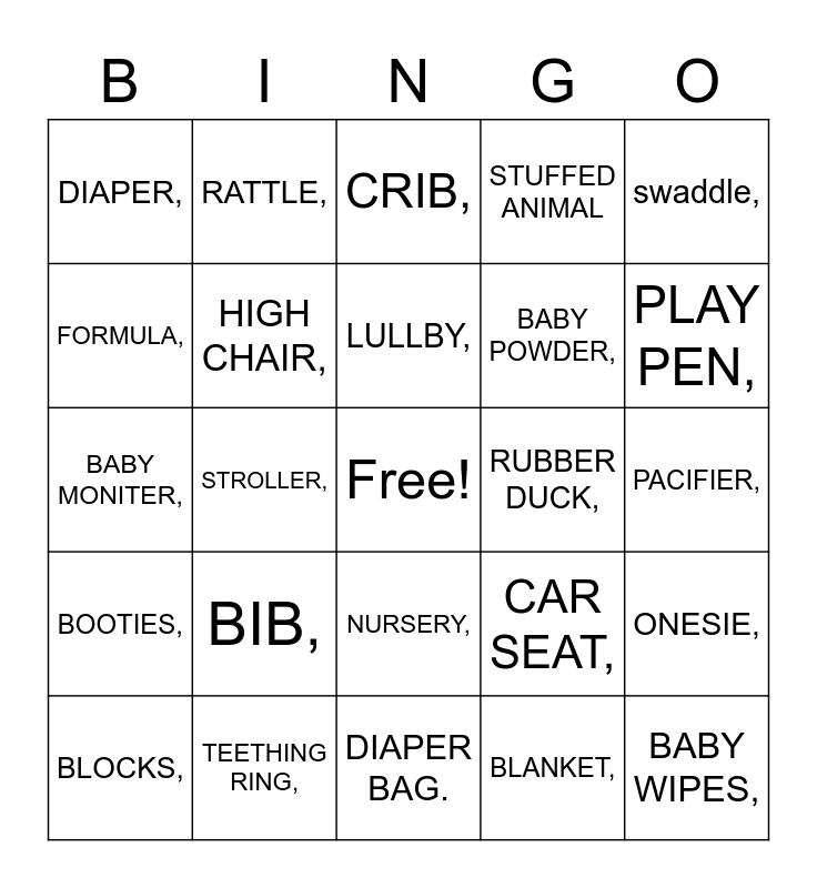 This bingo card has a free space and 24 words: BIB,, TEETHING RING,, LULLBY,, BLOCKS,, swaddle,, DIAPER,, FORMULA,, RATTLE,, RUBBER DUCK,, NURSERY,, BABY POWDER,, BABY MONITER,, CAR SEAT,, ONESIE,, HIGH CHAIR,, BLANKET,, PACIFIER,, CRIB,, PLAY PEN,, STROLLER,, BABY WIPES,, BOOTIES,, STUFFED ANIMAL and DIAPER BAG..