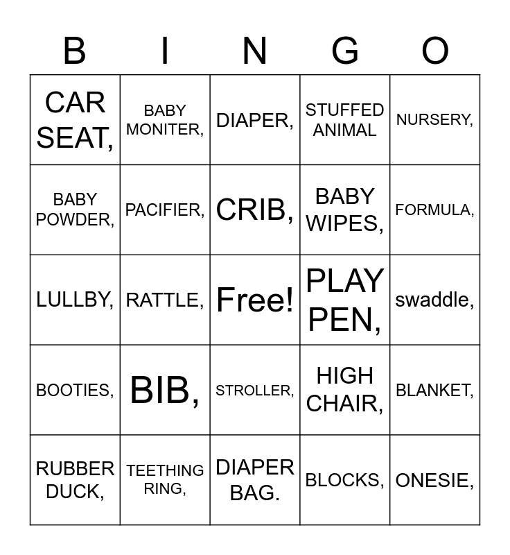 This bingo card has a free space and 24 words: BIB,, TEETHING RING,, CRIB,, RUBBER DUCK,, NURSERY,, CAR SEAT,, BABY POWDER,, BABY MONITER,, PLAY PEN,, STROLLER,, BABY WIPES,, LULLBY,, HIGH CHAIR,, BLANKET,, PACIFIER,, BLOCKS,, swaddle,, DIAPER,, FORMULA,, RATTLE,, ONESIE,, BOOTIES,, STUFFED ANIMAL and DIAPER BAG..