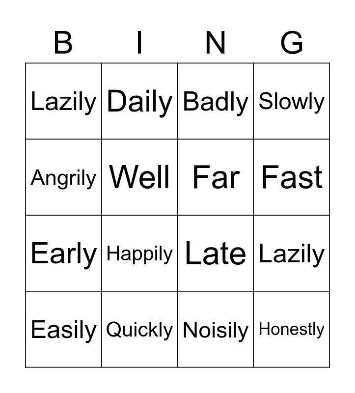 This bingo card has 22 words: Quickly, Easily, Daily, Fast, Well, Far, Lazily, Badly, Late, Honestly, Early, Slowly, Angrily, Happily, Noisily, Hard, Lazily, Easily, Happily, Angrily, Fast and Calmly.