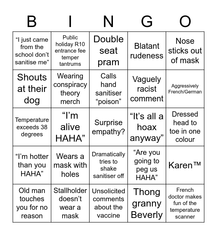 This bingo card has a free space and 24 words: Wears a mask with holes, Stallholder doesn’t wear a mask, Calls hand sanitiser “poison”, Old man touches you for no reason, Nose sticks out of mask, “I just came from the school don’t sanitise me”, Shouts at their dog, Public holiday R10 entrance fee temper tantrums, “It’s all a hoax anyway”, Dramatically tries to shake sanitiser off, Vaguely racist comment, Temperature exceeds 38 degrees, “Are you going to peg us HAHA”, Karen™, Wearing conspiracy theory merch, Thong granny Beverly, Dressed head to toe in one colour, Double seat pram, Aggressively French/German, “I’m alive HAHA”, French doctor makes fun of the temperature scanner, “I’m hotter than you HAHA”, Blatant rudeness and Unsolicited comments about the vaccine.
