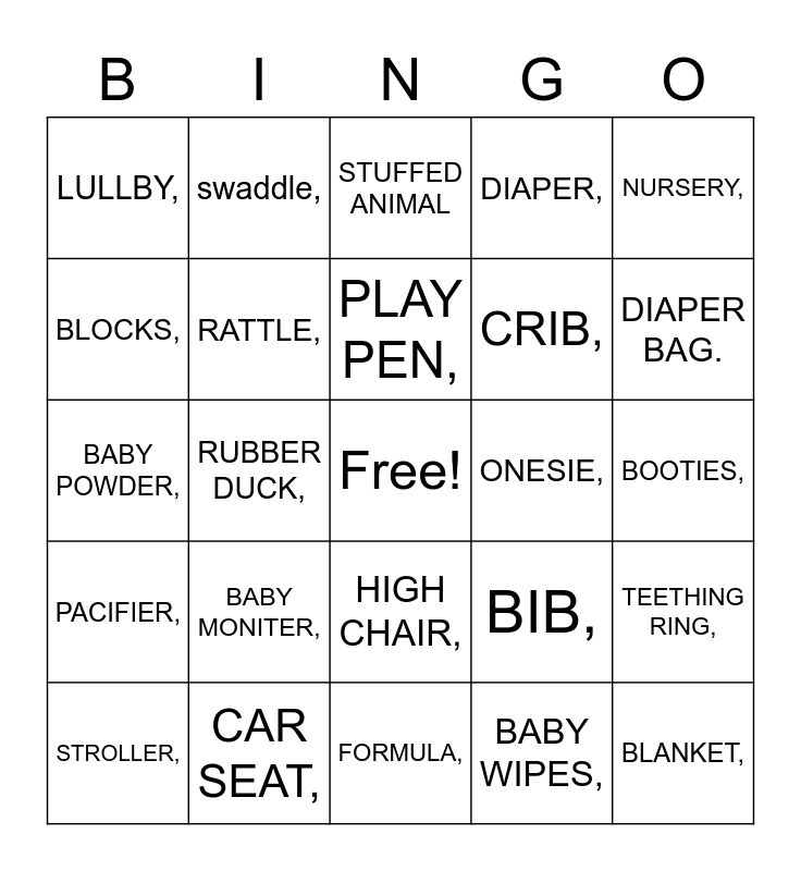 This bingo card has a free space and 24 words: BABY MONITER,, CAR SEAT,, PLAY PEN,, STROLLER,, NURSERY,, LULLBY,, BLOCKS,, swaddle,, ONESIE,, HIGH CHAIR,, CRIB,, BABY POWDER,, BIB,, TEETHING RING,, RATTLE,, BABY WIPES,, BOOTIES,, STUFFED ANIMAL, DIAPER BAG., RUBBER DUCK,, BLANKET,, PACIFIER,, DIAPER, and FORMULA,.