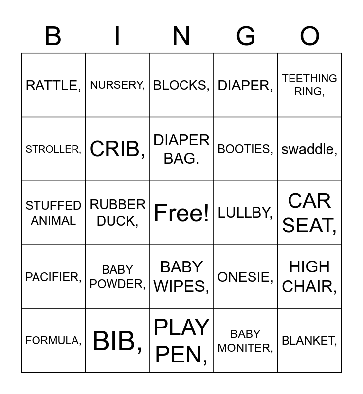 This bingo card has a free space and 24 words: BABY POWDER,, BIB,, DIAPER BAG., FORMULA,, TEETHING RING,, RATTLE,, STROLLER,, NURSERY,, LULLBY,, BABY WIPES,, BOOTIES,, STUFFED ANIMAL, ONESIE,, HIGH CHAIR,, CRIB,, BABY MONITER,, CAR SEAT,, BLOCKS,, swaddle,, RUBBER DUCK,, BLANKET,, PACIFIER,, DIAPER, and PLAY PEN,.