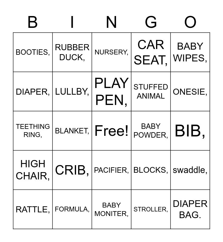 This bingo card has a free space and 24 words: RATTLE,, CRIB,, PLAY PEN,, STROLLER,, BABY WIPES,, BOOTIES,, RUBBER DUCK,, NURSERY,, BABY POWDER,, BIB,, TEETHING RING,, LULLBY,, BLOCKS,, swaddle,, DIAPER,, FORMULA,, BABY MONITER,, CAR SEAT,, ONESIE,, HIGH CHAIR,, BLANKET,, PACIFIER,, STUFFED ANIMAL and DIAPER BAG..