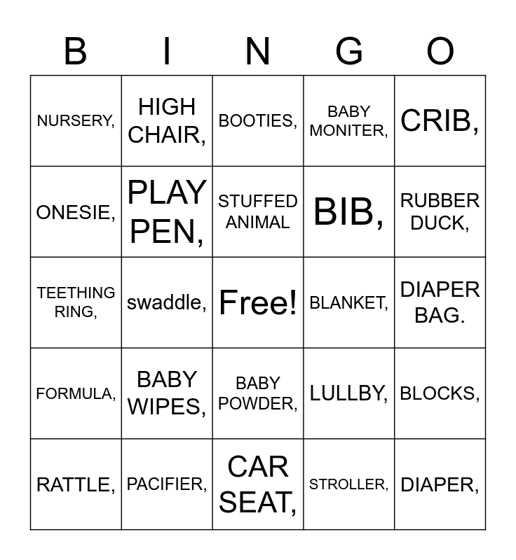 This bingo card has a free space and 24 words: BABY WIPES,, PACIFIER,, STUFFED ANIMAL, RATTLE,, CRIB,, NURSERY,, ONESIE,, HIGH CHAIR,, BLANKET,, BABY POWDER,, BIB,, TEETHING RING,, LULLBY,, BLOCKS,, PLAY PEN,, STROLLER,, DIAPER BAG., BOOTIES,, RUBBER DUCK,, swaddle,, DIAPER,, FORMULA,, BABY MONITER, and CAR SEAT,.