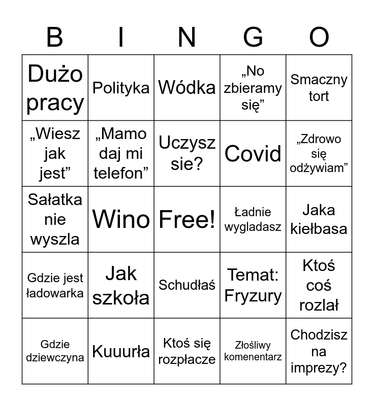 This bingo card has a free space and 24 words: Jak szkoła, Kuuurła, Uczysz sie?, Gdzie dziewczyna, Smaczny tort, Dużo pracy, „Wiesz jak jest”, Polityka, Ładnie wygladasz, Schudłaś, Covid, Sałatka nie wyszla, Temat: Fryzury, Ktoś coś rozlał, „Mamo daj mi telefon”, Złośliwy komenentarz, Jaka kiełbasa, Wódka, „Zdrowo się odżywiam”, Wino, Chodzisz na imprezy?, Gdzie jest ładowarka, „No zbieramy się” and Ktoś się rozpłacze.