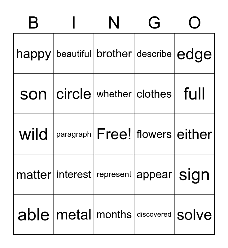 This bingo card has a free space and 24 words: interest, metal, whether, able, edge, happy, son, beautiful, flowers, represent, clothes, wild, appear, sign, circle, discovered, either, brother, full, paragraph, solve, matter, describe and months.
