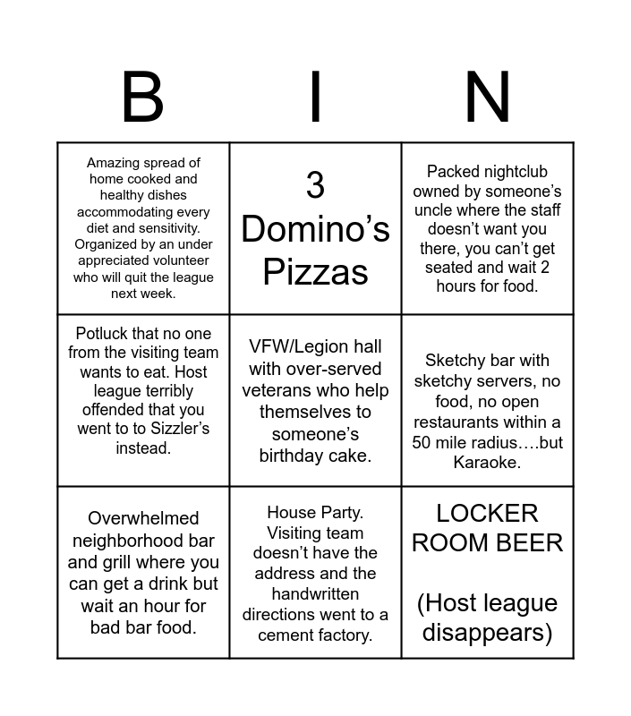 This bingo card has 9 words: Overwhelmed neighborhood bar and grill where you can get a drink but wait an hour for bad bar food., Packed nightclub owned by someone’s uncle where the staff doesn’t want you there, you can’t get seated and wait 2 hours for food., 3 Domino’s Pizzas, Potluck that no one from the visiting team wants to eat. Host league terribly offended that you went to to Sizzler’s instead., Amazing spread of home cooked and healthy dishes accommodating every diet and sensitivity. Organized by an under appreciated volunteer who will quit the league next week., Sketchy bar with sketchy servers, no food, no open restaurants within a 50 mile radius….but Karaoke., VFW/Legion hall with over-served veterans who help themselves to someone’s birthday cake., LOCKER ROOM BEER (Host league disappears) and House Party. Visiting team doesn’t have the address and the handwritten directions went to a cement factory..