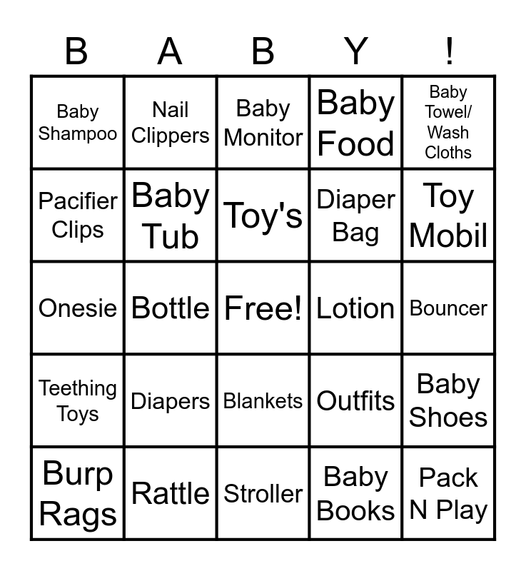This bingo card has a free space and 33 words: Diaper Cream, Swaddle, Bottle, Baby Wrap Carrier, Teething Toys, Baby Tub, Baby Towel/ Wash Cloths, Burp Rags, Nail Clippers, Jumperoo, Toy's, Baby Monitor, Socks, Pacifier, Lotion, Toy Mobil, Rattle, Onesie, Diapers, Outfits, Blankets, Baby Powder, Baby Shampoo, Bouncer, Stroller, Pack N Play, Baby Food, Diaper Bag, Pacifier Clips, Baby Shoes, Play Mat, Baby Books and Stuffed Animal.