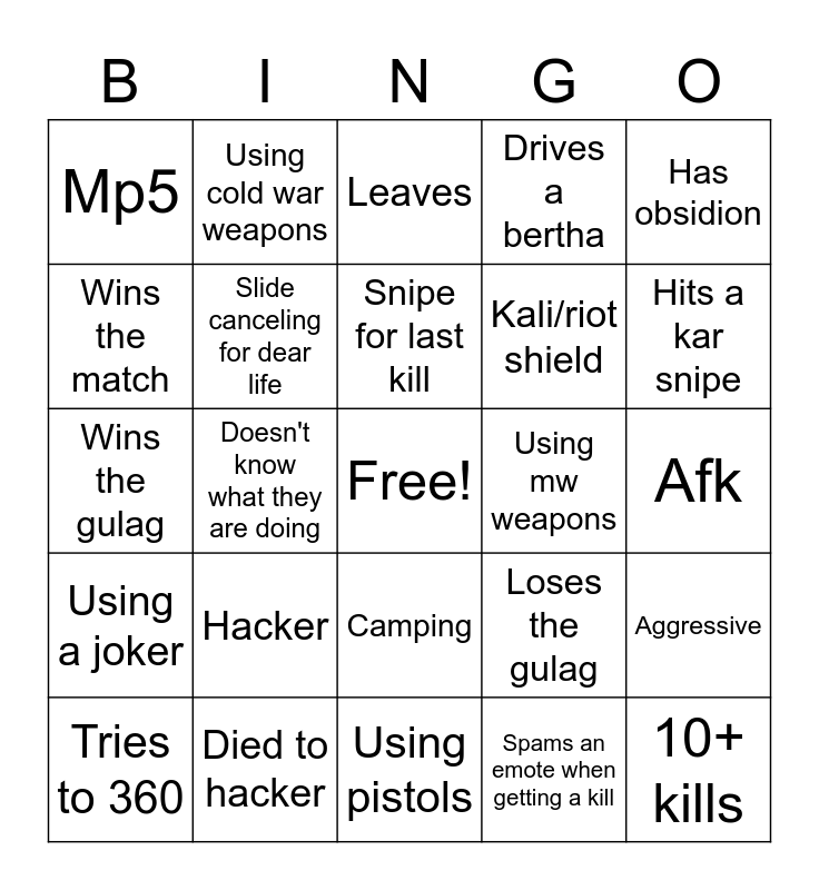 This bingo card has a free space and 24 words: Hacker, Died to hacker, Snipe for last kill, Tries to 360, Has obsidion, Mp5, Wins the match, Using cold war weapons, Using mw weapons, Camping, Kali/riot shield, Wins the gulag, Loses the gulag, Aggressive, Slide canceling for dear life, Spams an emote when getting a kill, Afk, Leaves, Hits a kar snipe, Doesn't know what they are doing, 10+ kills, Using a joker, Drives a bertha and Using pistols.