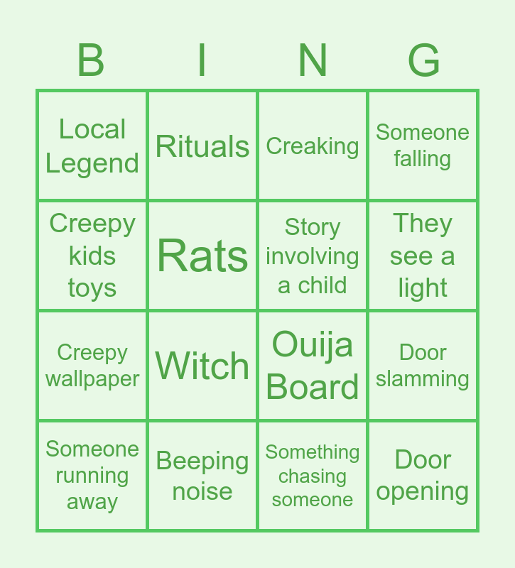 This bingo card has 38 words: "I'm hearing something", "I need to get out of here", "Did you hear that?", Story involving a child, Story involving a murder, They see a shadow, They see a light, Medical equipment, Creepy kids toys, Creepy wallpaper, Door slamming, Someone falling, Someone running away, Something chasing someone, Rats, Door opening, Whispering, Creaking, Voice recorder, Beeping noise, Local Legend, Demon, Witch, Spirit, "Oh God", "Oh Jesus", Phone ringging, Background noise, Curse words, Freezing Temperatures, Suicide, Holy water, Satanists, Rituals, Sacrifices, Spirit box, Ouija Board and Salt.