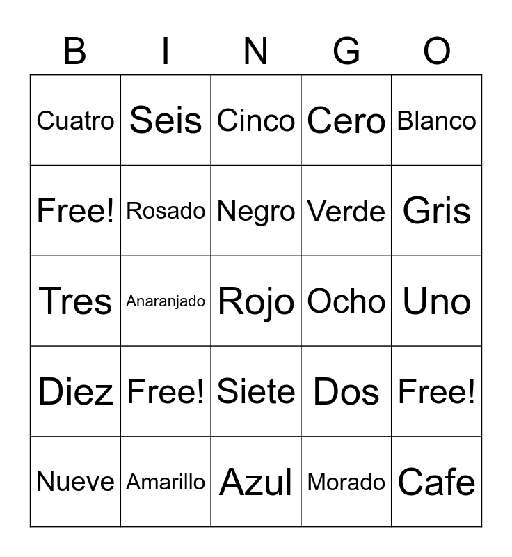 This bingo card has a free space and 24 words: Free!, Amarillo, Negro, Nueve, Blanco, Cuatro, Free!, Seis, Ocho, Siete, Verde, Tres, Dos, Free!, Rosado, Morado, Uno, Cinco, Gris, Anaranjado, Cafe, Diez, Cero and Azul.