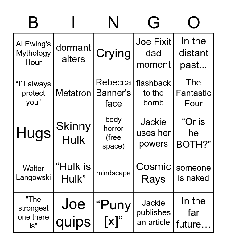 This bingo card has a free space and 24 words: “Hulk is Hulk”, Joe quips, Rebecca Banner's face, "The strongest one there is", In the distant past..., Al Ewing's Mythology Hour, “I’ll always protect you”, dormant alters, Jackie uses her powers, mindscape, flashback to the bomb, Hugs, Cosmic Rays, someone is naked, Metatron, Jackie publishes an article, “Or is he BOTH?”, Crying, The Fantastic Four, Skinny Hulk, In the far future…, Walter Langowski, Joe Fixit dad moment and “Puny [x]”.