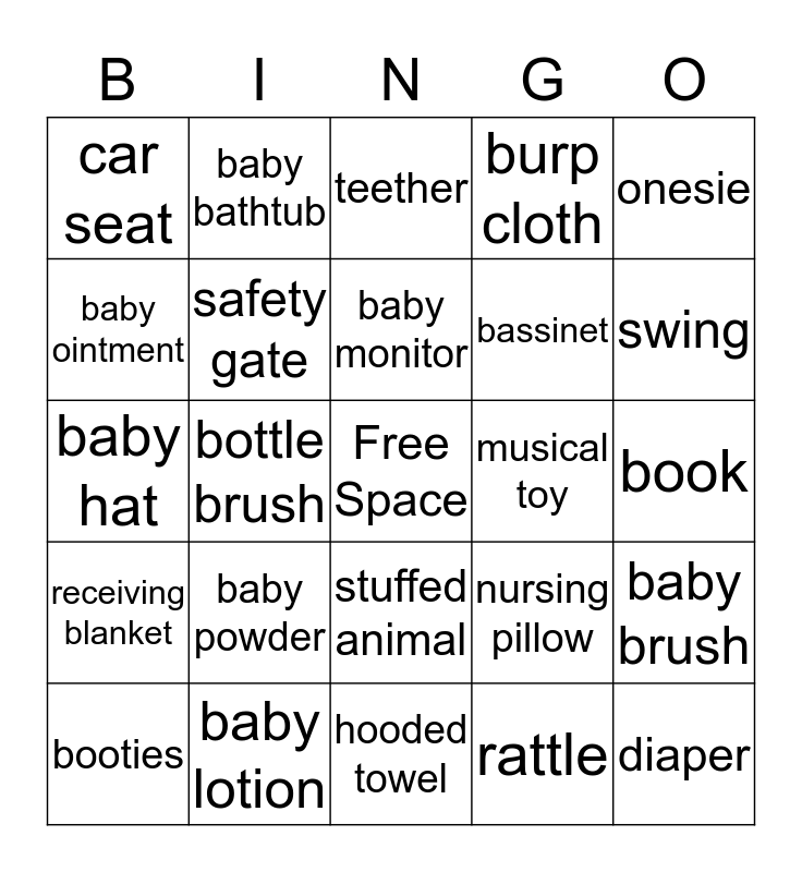 This bingo card has a free space and 45 words: bottle, diaper, blanket, booties, pacifier, rattle, teether, bib, onesie, baby lotion, burp cloth, musical toy, stuffed animal, baby powder, baby shampoo, hooded towel, formula, baby hat, baby socks, swing, baby bathtub, diaper bag, stroller, car seat, high chair, book, bottle warmer, diaper disposal, nursing pillow, receiving blanket, mobile, baby brush, rubber duck, baby shoes, baby shirt, bottle brush, baby nail clipper, baby wipes, baby carrier, baby monitor, baby ointment, bassinet, changing table, safety gate and stroller.