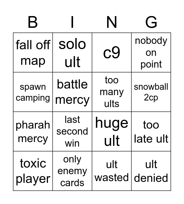 This bingo card has 16 words: only enemy cards, too late ult, c9, fall off map, pharah mercy, solo ult, huge ult, ult wasted, spawn camping, battle mercy, toxic player, nobody on point, last second win, snowball 2cp, too many ults and ult denied.