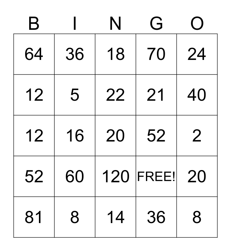 This bingo card has 25 words: 60, 14, 22, 81, 24, 64, 12, 36, 52, 120, 21, 12, FREE!, 20, 5, 8, 2, 18, 40, 16, 20, 8, 52, 70 and 36.