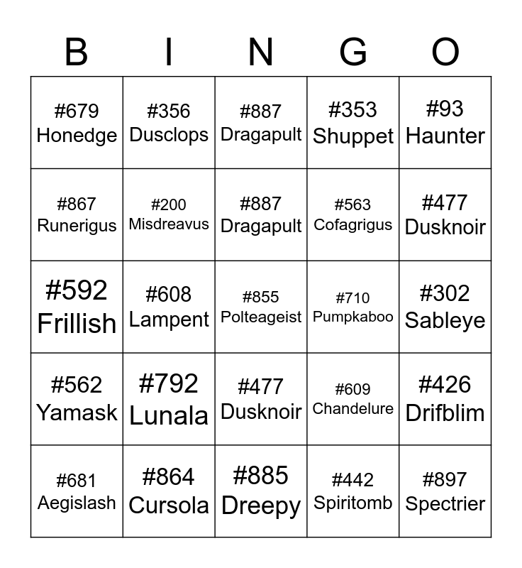 This bingo card has a free space and 24 words: #792 Lunala, #864 Cursola, #887 Dragapult, #681 Aegislash, #93 Haunter, #679 Honedge, #867 Runerigus, #356 Dusclops, #710 Pumpkaboo, #477 Dusknoir, #563 Cofagrigus, #592 Frillish, #609 Chandelure, #426 Drifblim, #200 Misdreavus, #442 Spiritomb, #302 Sableye, #887 Dragapult, #477 Dusknoir, #608 Lampent, #897 Spectrier, #562 Yamask, #353 Shuppet and #885 Dreepy.