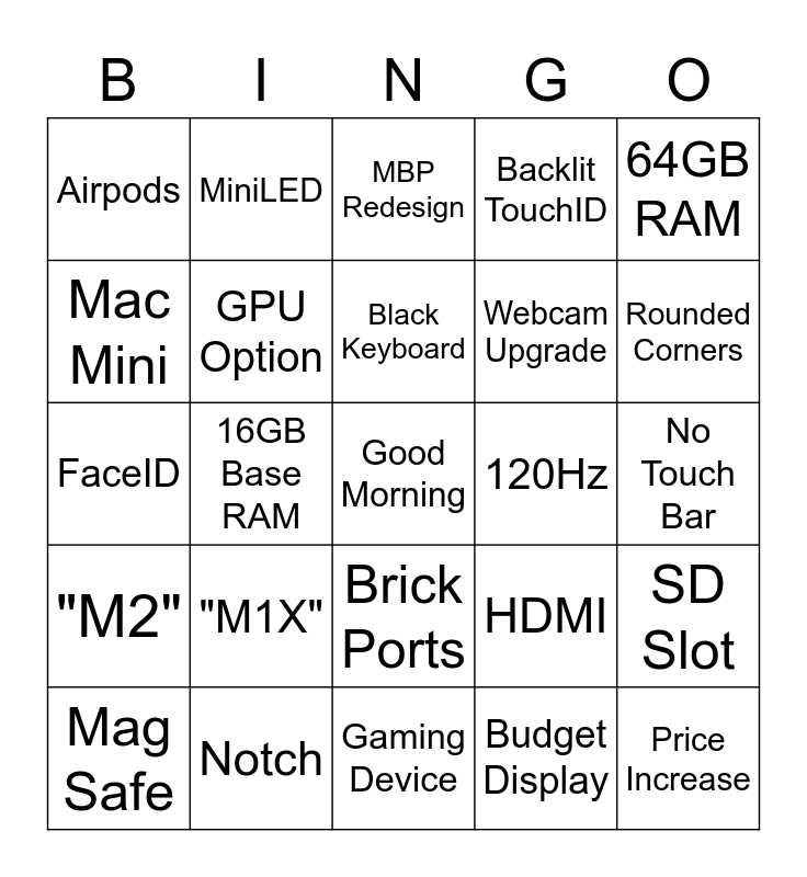 This bingo card has a free space and 24 words: "M1X", Notch, Black Keyboard, Mag Safe, 64GB RAM, Airpods, Mac Mini, MiniLED, 120Hz, Brick Ports, Webcam Upgrade, FaceID, HDMI, SD Slot, GPU Option, Budget Display, No Touch Bar, MBP Redesign, Rounded Corners, 16GB Base RAM, Price Increase, "M2", Backlit TouchID and Gaming Device.