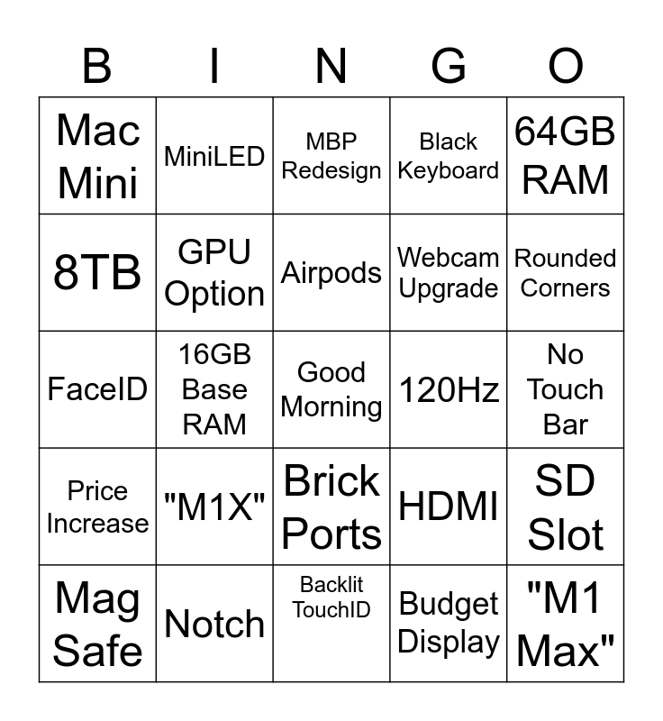 This bingo card has a free space and 24 words: "M1X", Notch, Airpods, Mag Safe, 64GB RAM, Mac Mini, 8TB, MiniLED, 120Hz, Brick Ports, Webcam Upgrade, FaceID, HDMI, SD Slot, GPU Option, Budget Display, No Touch Bar, MBP Redesign, Rounded Corners, 16GB Base RAM, "M1 Max", Price Increase, Black Keyboard and Backlit TouchID.
