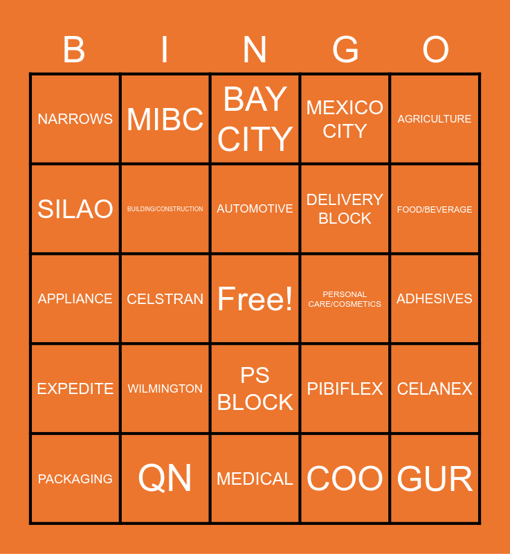 This bingo card has a free space and 80 words: LAS COLINAS, AUBURN HILLS, BAY CITY, BISHOP, BOUCHERVILLE, CAMPO BOM, CANGREJERA, CLEAR LAKE, EDMONTON, ENOREE, EVANSVILLE, FLORENCE, MEXICO CITY, NARROWS, SHELBY, SILAO, SUZANO, WILMINGTON, WINONA, ADHESIVES, AEROSPACE, AGRICULTURE, APPLIANCE, AUTOMOTIVE, BUILDING/CONSTRUCTION, CHEMICALS, COATINGS, CONSUMER GOODS, ELECTRONICS, ENERGY, FOOD/BEVERAGE, INDUSTRIAL, MEDICAL, OIL/GAS, PACKAGING, PERSONAL CARE/COSMETICS, POM, LFT, PBT, GUR, PPS, HAC, VAM, DMA, ETAC, MIBC, TMA, CELCON, HOSTAFORM, FORTRON, CELANEX, CELSTRAN, PIBIFLEX, ATEVA, BLUERIDGE, NUTRINOVA, PANOSORB, SUNETT, VINOSORB, PS BLOCK, DELIVERY BLOCK, BILLING BLOCK, HEADER, ROUTE, PEOPLE, SAFETY, CUSTOMERS, QUALITY, COMMUNITY, SHAREHOLDERS, EXPEDITE, QN, RGA, OUTPUT, ORDER COCKPIT, CMS, COO, COA, USMCA and PPAP.