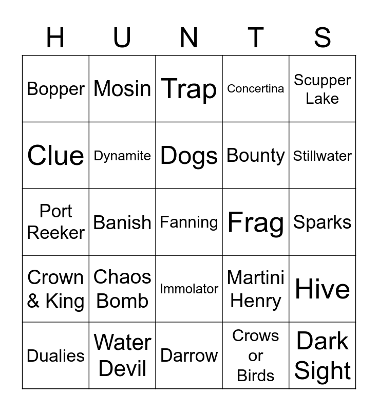This bingo card has 26 words: Immolator, Crows or Birds, Dogs, Water Devil, Scupper Lake, Bopper, Clue, Mosin, Sparks, Martini Henry, Bounty, Port Reeker, Hive, Dualies, Banish, Extraction or Exit, Concertina, Crown & King, Trap, Fanning, Stillwater, Darrow, Frag, Chaos Bomb, Dynamite and Dark Sight.