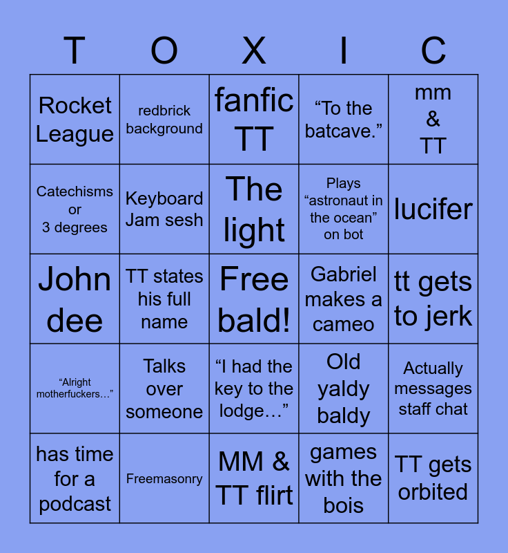 This bingo card has a free space and 24 words: Talks over someone, Freemasonry, The light, has time for a podcast, mm & TT, Rocket League, Catechisms or 3 degrees, redbrick background, Gabriel makes a cameo, “I had the key to the lodge…”, Plays “astronaut in the ocean” on bot, John dee, Old yaldy baldy, Actually messages staff chat, Keyboard Jam sesh, games with the bois, tt gets to jerk, fanfic TT, lucifer, TT states his full name, TT gets orbited, “Alright motherfuckers…”, “To the batcave.” and MM & TT flirt.